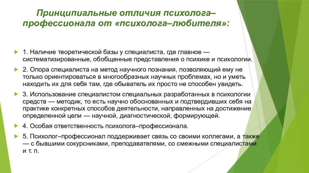 1. Наличие теоретической базы у специалиста, где главное — систематизированные, обобщенные представления о психике и психологии. 2. Опора специалиста на метод научного познания, позволяющий ему не только ориентироваться в многообразных научных проблемах, но и уметь находить их для себя там, где обыватель их просто не способен увидеть. 3. Использование специалистом специальных разработанных в психологии средств — методик, то есть научно обоснованных и подтвердивших себя на практике конкретных способов деятельности, направленных на достижение определенной цели — научной, диагностической, формирующей. 4. Особая ответственность психолога–профессионала. 5. Психолог–профессионал поддерживает связь со своими коллегами, а также — с бывшими сокурсниками, преподавателями, со смежными специалистами и т. п.