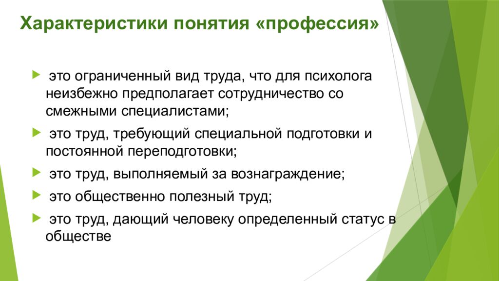 это ограниченный вид труда, что для психолога неизбежно предполагает сотрудничество со смежными специалистами; это труд, требующий специальной подготовки и постоянной переподготовки; это труд, выполняемый за вознаграждение; это общественно полезный труд; это труд, дающий человеку определенный статус в обществе