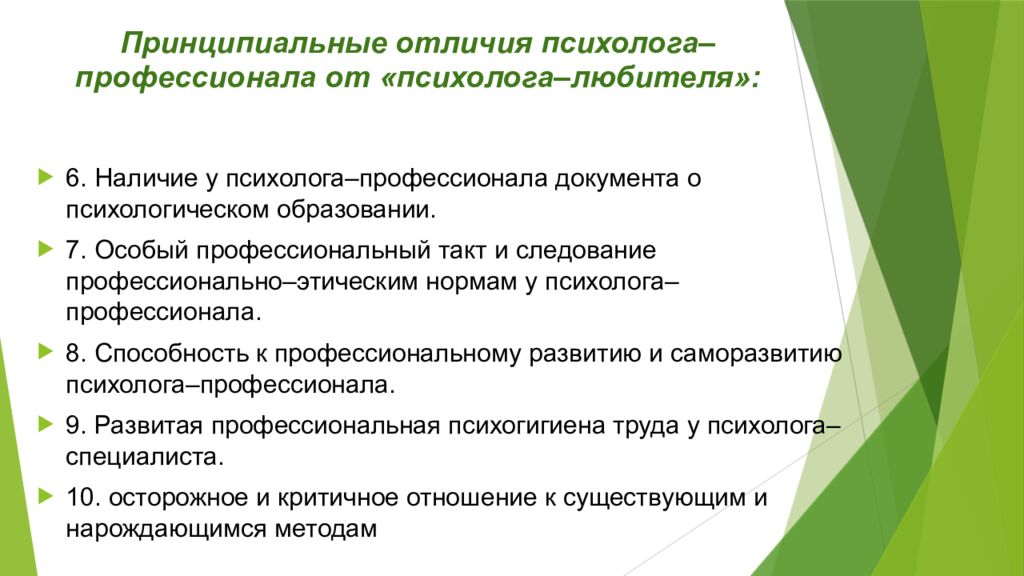 6. Наличие у психолога–профессионала документа о психологическом образовании. 7. Особый профессиональный такт и следование профессионально–этическим нормам у психолога–профессионала. 8. Способность к профессиональному развитию и саморазвитию психолога–профессионала. 9. Развитая профессиональная психогигиена труда у психолога–специалиста. 10. осторожное и критичное отношение к существующим и нарождающимся методам