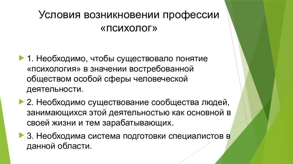 1. Необходимо, чтобы существовало понятие «психология» в значении востребованной обществом особой сферы человеческой деятельности. 2. Необходимо существование сообщества людей, занимающихся этой деятельностью как основной в своей жизни и тем зарабатывающих. 3. Необходима система подготовки специалистов в данной области.