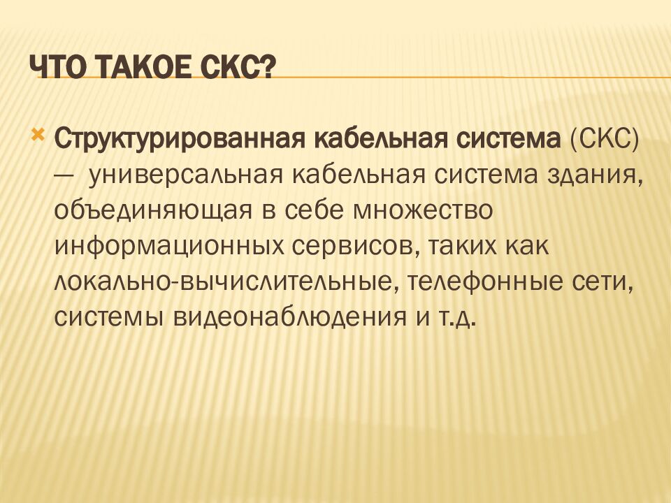 Структурированная кабельная система (СКС) — универсальная кабельная система здания, объединяющая в себе множество информационных сервисов, таких как локально-вычислительные, телефонные сети, системы видеонаблюдения и т.д.