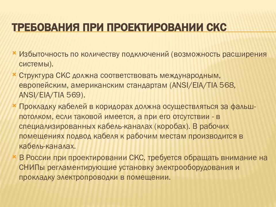 Избыточность по количеству подключений (возможность расширения системы). Структура СКС должна соответствовать международным, европейским, американским стандартам (ANSI/EIA/TIA 568, ANSI/EIA/TIA 569). Прокладку кабелей в коридорах должна осуществляться за фальш-потолком, если таковой имеется, а при его отсутствии - в специализированных кабель-каналах (коробах). В рабочих помещениях подвод кабеля к рабочим местам производится в кабель-каналах. В России при проектировании СКС, требуется обращать внимание на СНИПы регламентирующие установку электрооборудования и прокладку электропроводки в помещении.
