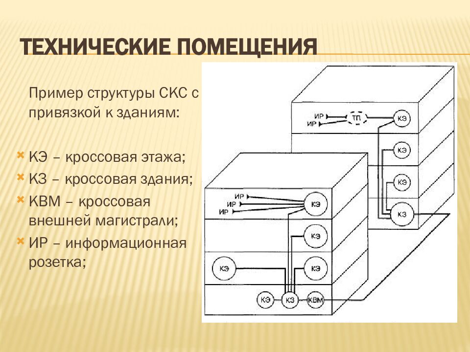 Пример структуры СКС с привязкой к зданиям: КЭ – кроссовая этажа; КЗ – кроссовая здания; КВМ – кроссовая внешней магистрали; ИР – информационная розетка;