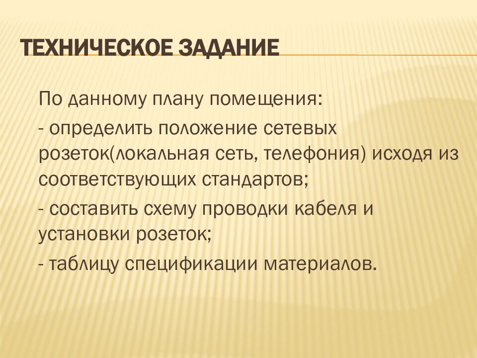 По данному плану помещения: - определить положение сетевых розеток(локальная сеть, телефония) исходя из соответствующих стандартов; - составить схему проводки кабеля и установки розеток; - таблицу спецификации материалов.