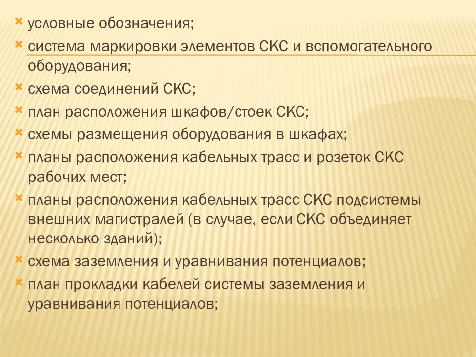 условные обозначения; система маркировки элементов СКС и вспомогательного оборудования; схема соединений СКС; план расположения шкафов/стоек СКС; схемы размещения оборудования в шкафах; планы расположения кабельных трасс и розеток СКС рабочих мест; планы расположения кабельных трасс СКС подсистемы внешних магистралей (в случае, если СКС объединяет несколько зданий); схема заземления и уравнивания потенциалов; план прокладки кабелей системы заземления и уравнивания потенциалов;