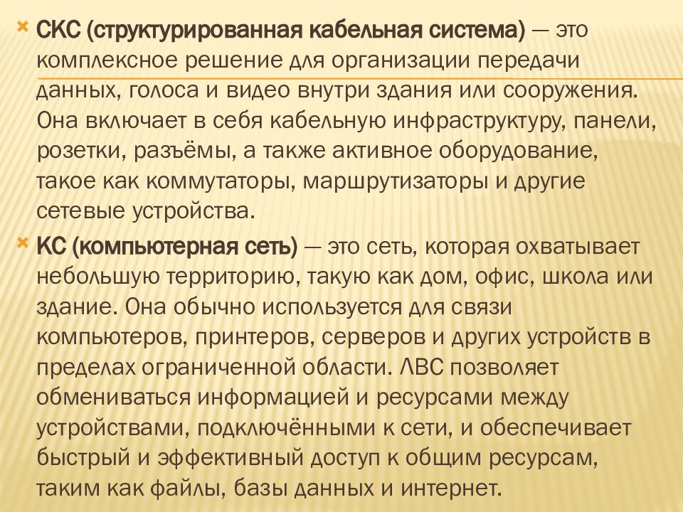 СКС (структурированная кабельная система) — это комплексное решение для организации передачи данных, голоса и видео внутри здания или сооружения. Она включает в себя кабельную инфраструктуру, панели, розетки, разъёмы, а также активное оборудование, такое как коммутаторы, маршрутизаторы и другие сетевые устройства. КС (компьютерная сеть) — это сеть, которая охватывает небольшую территорию, такую как дом, офис, школа или здание. Она обычно используется для связи компьютеров, принтеров, серверов и других устройств в пределах ограниченной области. ЛВС позволяет обмениваться информацией и ресурсами между устройствами, подключёнными к сети, и обеспечивает быстрый и эффективный доступ к общим ресурсам, таким как файлы, базы данных и интернет.