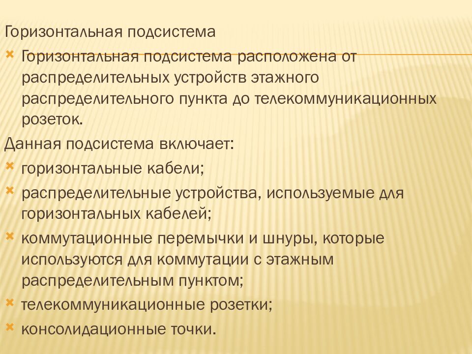 Горизонтальная подсистема Горизонтальная подсистема расположена от распределительных устройств этажного распределительного пункта до телекоммуникационных розеток. Данная подсистема включает: горизонтальные кабели; распределительные устройства, используемые для горизонтальных кабелей; коммутационные перемычки и шнуры, которые используются для коммутации с этажным распределительным пунктом; телекоммуникационные розетки; консолидационные точки.
