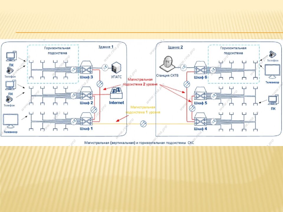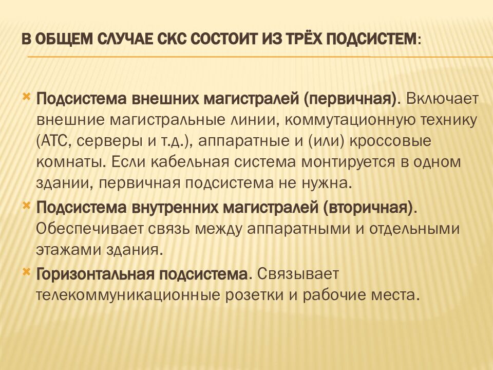 Подсистема внешних магистралей (первичная). Включает внешние магистральные линии, коммутационную технику (АТС, серверы и т.д.), аппаратные и (или) кроссовые комнаты. Если кабельная система монтируется в одном здании, первичная подсистема не нужна. Подсистема внутренних магистралей (вторичная). Обеспечивает связь между аппаратными и отдельными этажами здания. Горизонтальная подсистема. Связывает телекоммуникационные розетки и рабочие места.