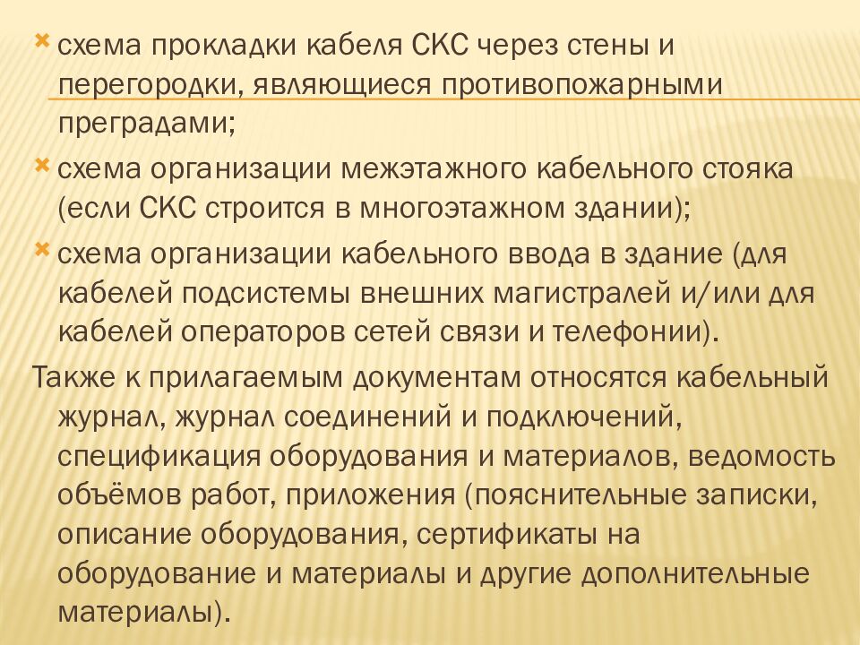 схема прокладки кабеля СКС через стены и перегородки, являющиеся противопожарными преградами; схема организации межэтажного кабельного стояка (если СКС строится в многоэтажном здании); схема организации кабельного ввода в здание (для кабелей подсистемы внешних магистралей и/или для кабелей операторов сетей связи и телефонии). Также к прилагаемым документам относятся кабельный журнал, журнал соединений и подключений, спецификация оборудования и материалов, ведомость объёмов работ, приложения (пояснительные записки, описание оборудования, сертификаты на оборудование и материалы и другие дополнительные материалы).