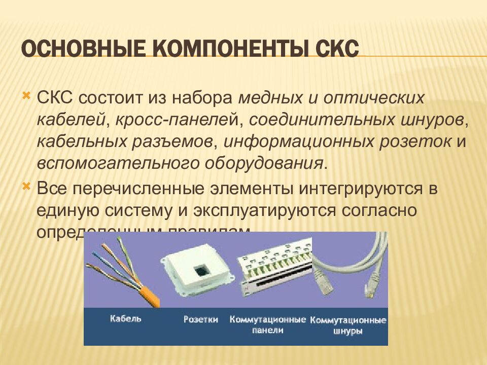 СКС состоит из набора медных и оптических кабелей, кросс-панеле й, соединительных шнуров, кабельных разъемов, информационных розеток и вспомогательного оборудования. Все перечисленные элементы интегрируются в единую систему и эксплуатируются согласно определенным правилам.