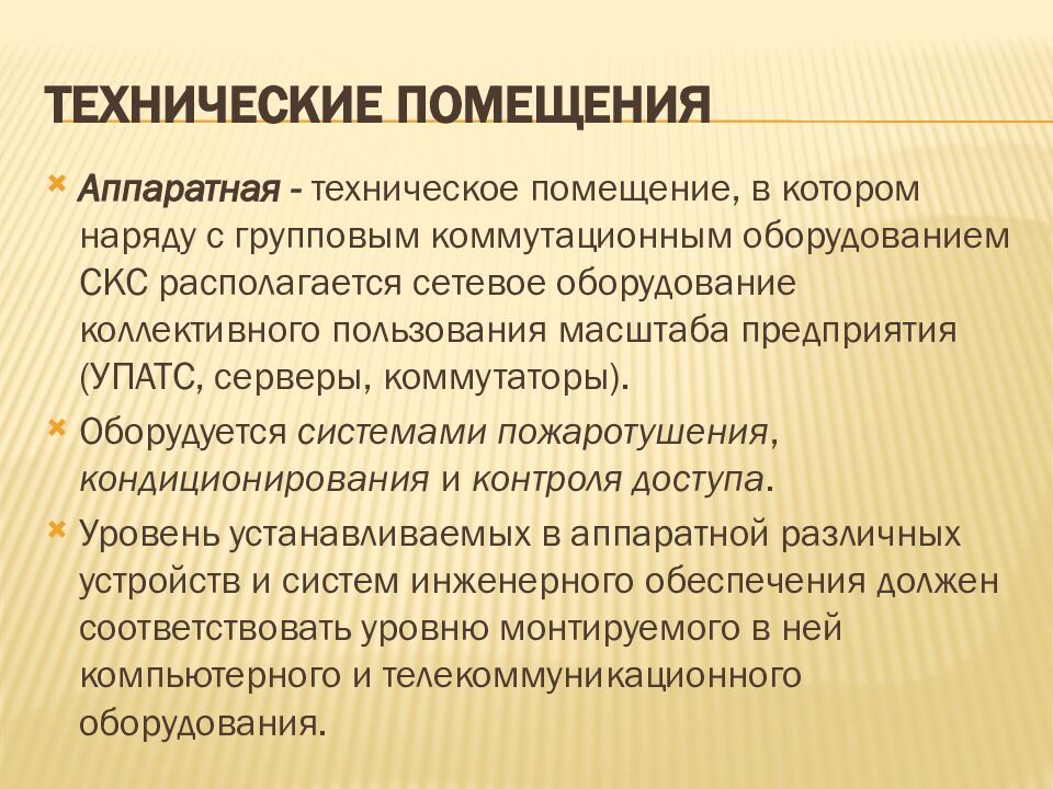 Аппаратная - техническое помещение, в котором наряду с групповым коммутационным оборудованием СКС располагается сетевое оборудование коллективного пользования масштаба предприятия (УПАТС, серверы, коммутаторы). Оборудуется системами пожаротушения, кондиционирования и контроля доступа. Уровень устанавливаемых в аппаратной различных устройств и систем инженерного обеспечения должен соответствовать уровню монтируемого в ней компьютерного и телекоммуникационного оборудования.