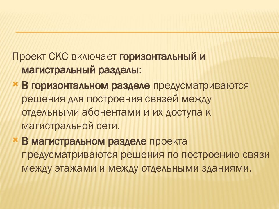 Проект СКС включает горизонтальный и магистральный разделы : В горизонтальном разделе предусматриваются решения для построения связей между отдельными абонентами и их доступа к магистральной сети. В магистральном разделе проекта предусматриваются решения по построению связи между этажами и между отдельными зданиями.
