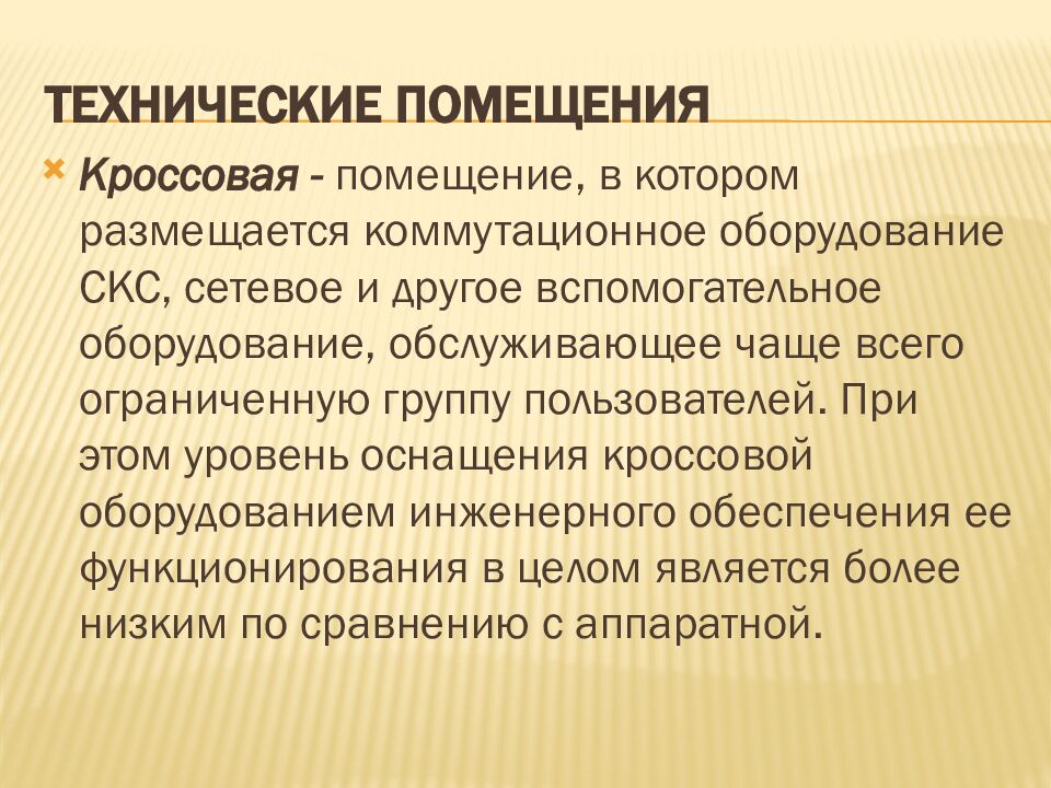 Кроссовая - помещение, в котором размещается коммутационное оборудование СКС, сетевое и другое вспомогательное оборудование, обслуживающее чаще всего ограниченную группу пользователей. При этом уровень оснащения кроссовой оборудованием инженерного обеспечения ее функционирования в целом является более низким по сравнению с аппаратной.