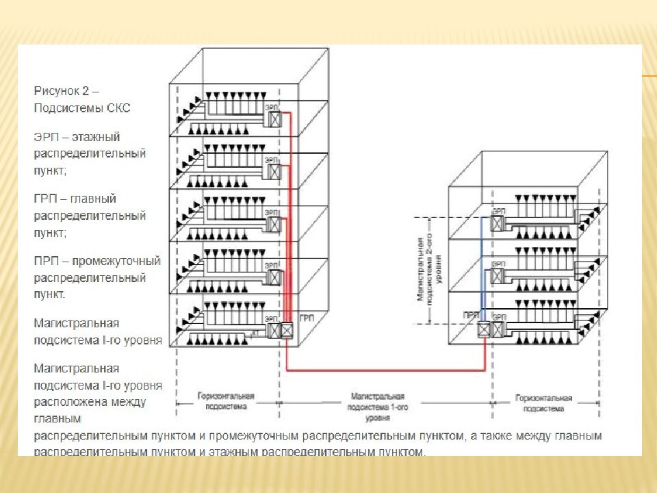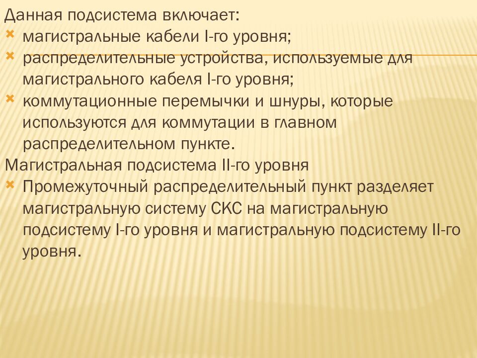 Данная подсистема включает: магистральные кабели I-го уровня; распределительные устройства, используемые для магистрального кабеля I-го уровня; коммутационные перемычки и шнуры, которые используются для коммутации в главном распределительном пункте. Магистральная подсистема II-го уровня Промежуточный распределительный пункт разделяет магистральную систему СКС на магистральную подсистему I-го уровня и магистральную подсистему II-го уровня.