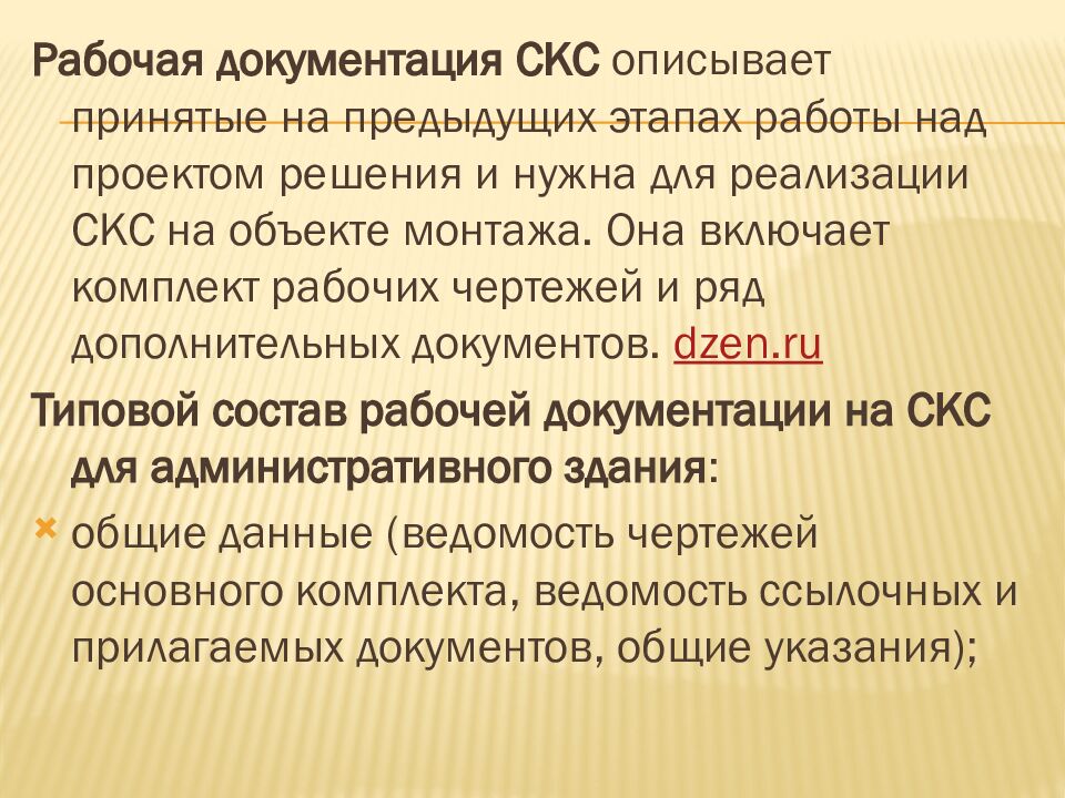 Рабочая документация СКС описывает принятые на предыдущих этапах работы над проектом решения и нужна для реализации СКС на объекте монтажа. Она включает комплект рабочих чертежей и ряд дополнительных документов. dzen.ru Типовой состав рабочей документации на СКС для административного здания : общие данные (ведомость чертежей основного комплекта, ведомость ссылочных и прилагаемых документов, общие указания);