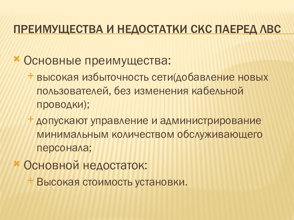 Основные преимущества: высокая избыточность сети(добавление новых пользователей, без изменения кабельной проводки); допускают управление и администрирование минимальным количеством обслуживающего персонала; Основной недостаток: Высокая стоимость установки.