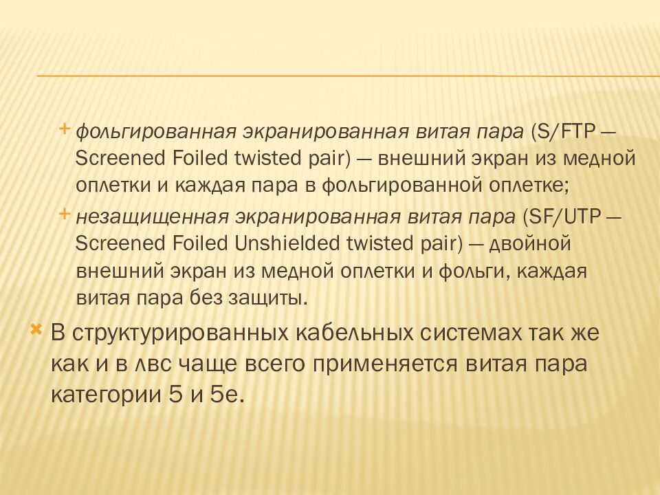 фольгированная экранированная витая пара ( S/FTP — Screened Foiled twisted pair) — внешний экран из медной оплетки и каждая пара в фольгированной оплетке; незащищенная экранированная витая пара ( SF/UTP — Screened Foiled Unshielded twisted pair) — двойной внешний экран из медной оплетки и фольги, каждая витая пара без защиты. В структурированных кабельных системах так же как и в лвс чаще всего применяется витая пара категории 5 и 5е.