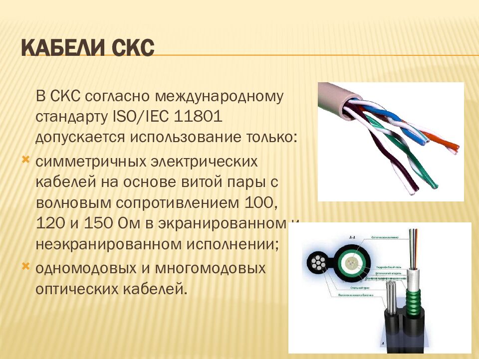 В СКС согласно международному стандарту ISO / IEC 11801 допускается использование только: симметричных электрических кабелей на основе витой пары с волновым сопротивлением 100, 120 и 150 Ом в экранированном и неэкранированном исполнении; одномодовых и многомодовых оптических кабелей.
