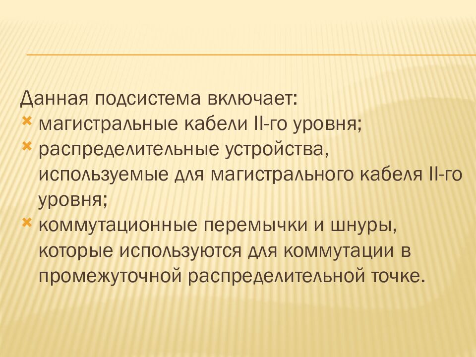 Данная подсистема включает: магистральные кабели II-го уровня; распределительные устройства, используемые для магистрального кабеля II-го уровня; коммутационные перемычки и шнуры, которые используются для коммутации в промежуточной распределительной точке.