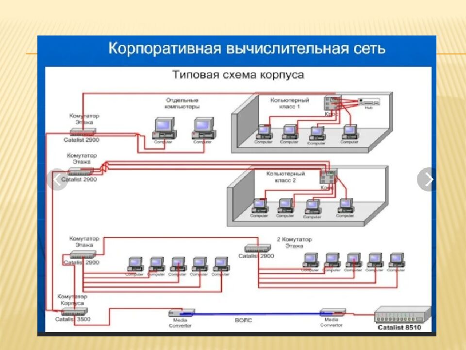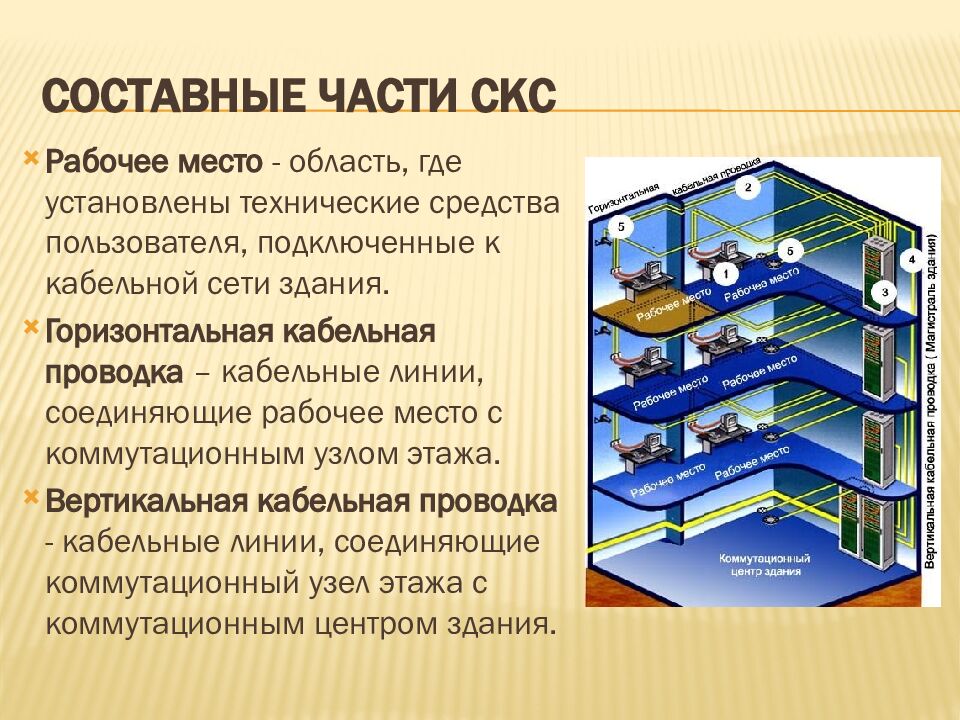 Рабочее место - область, где установлены технические средства пользователя, подключенные к кабельной сети здания. Горизонтальная кабельная проводка – кабельные линии, соединяющие рабочее место с коммутационным узлом этажа. Вертикальная кабельная проводка - кабельные линии, соединяющие коммутационный узел этажа с коммутационным центром здания.