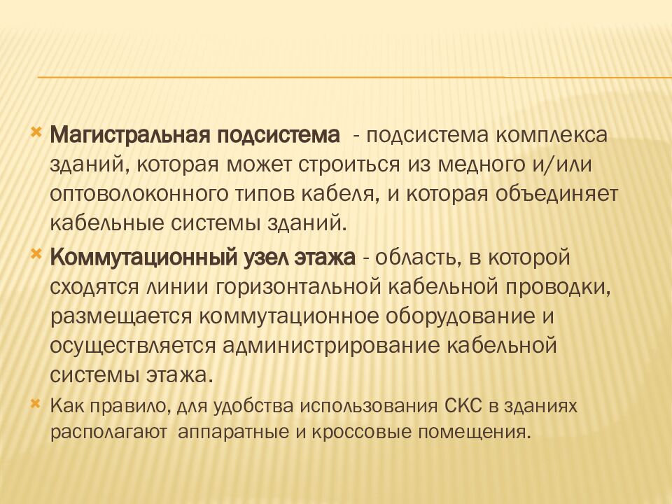 Магистральная подсистема - подсистема комплекса зданий, которая может строиться из медного и/или оптоволоконного типов кабеля, и которая объединяет кабельные системы зданий. Коммутационный узел этажа - область, в которой сходятся линии горизонтальной кабельной проводки, размещается коммутационное оборудование и осуществляется администрирование кабельной системы этажа. Как правило, для удобства использования скс в зданиях располагают аппаратные и кроссовые помещения.