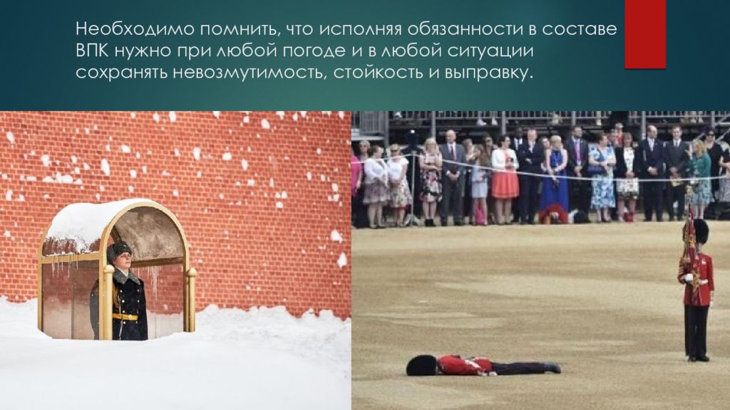Слайд 33: Необходимо помнить, что исполняя обязанности в составе ВПК нужно при любой погоде и в любой ситуации сохранять невозмутимость, стойкость и выправку