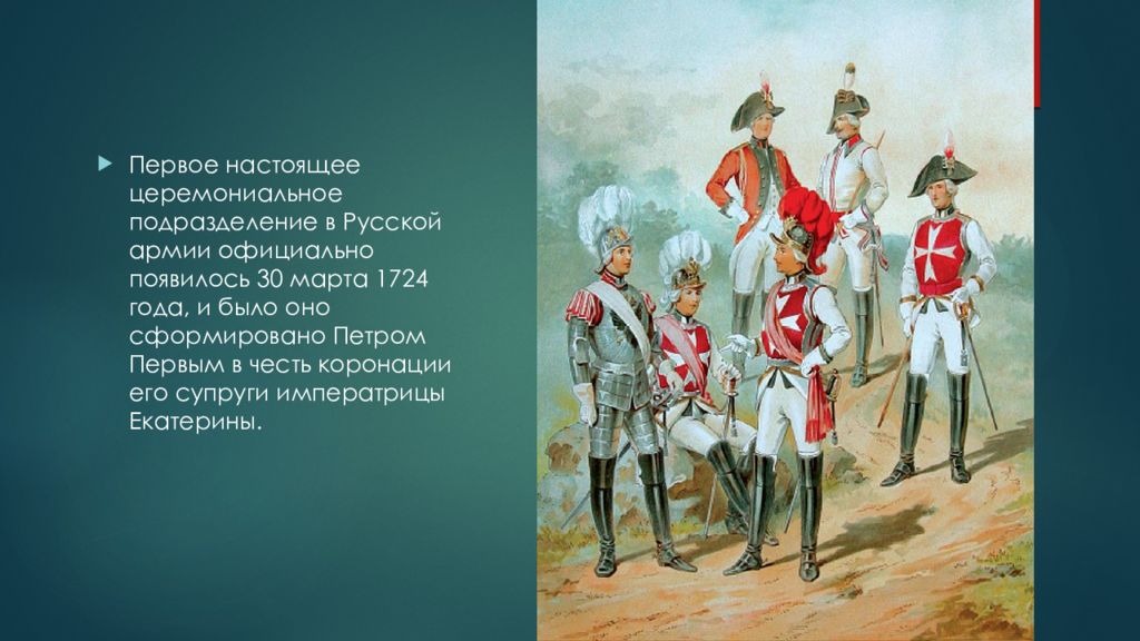 Первое настоящее церемониальное подразделение в Русской армии официально появилось 30 марта 1724 года, и было оно сформировано Петром Первым в честь коронации его супруги императрицы Екатерины.