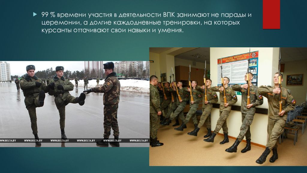 99 % времени участия в деятельности ВПК занимают не парады и церемонии, а долгие каждодневные тренировки, на которых курсанты оттачивают свои навыки и умения.