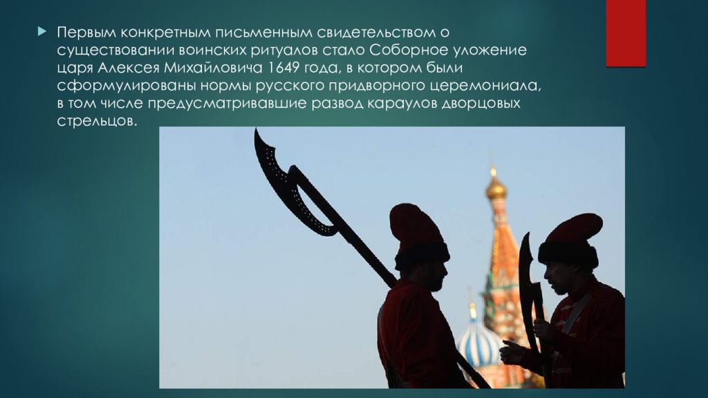 Первым конкретным письменным свидетельством о существовании воинских ритуалов стало Соборное уложение царя Алексея Михайловича 1649 года, в котором были сформулированы нормы русского придворного церемониала, в том числе предусматривавшие развод караулов дворцовых стрельцов.