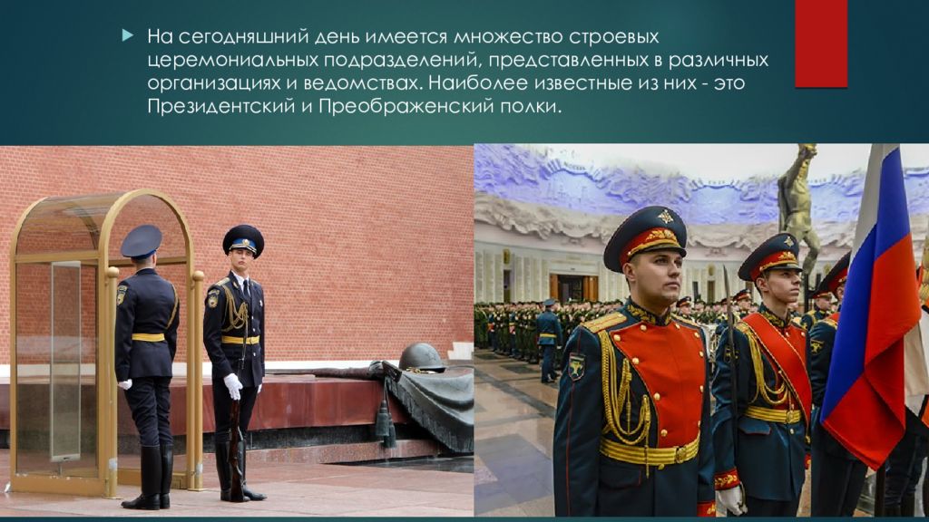 На сегодняшний день имеется множество строевых церемониальных подразделений, представленных в различных организациях и ведомствах. Наиболее известные из них - это Президентский и Преображенский полки.