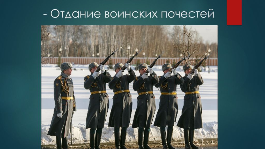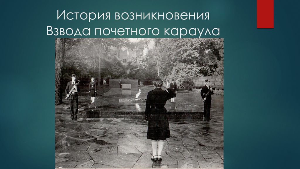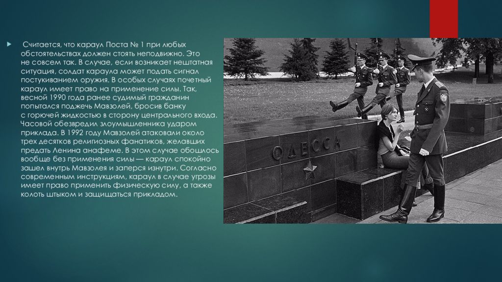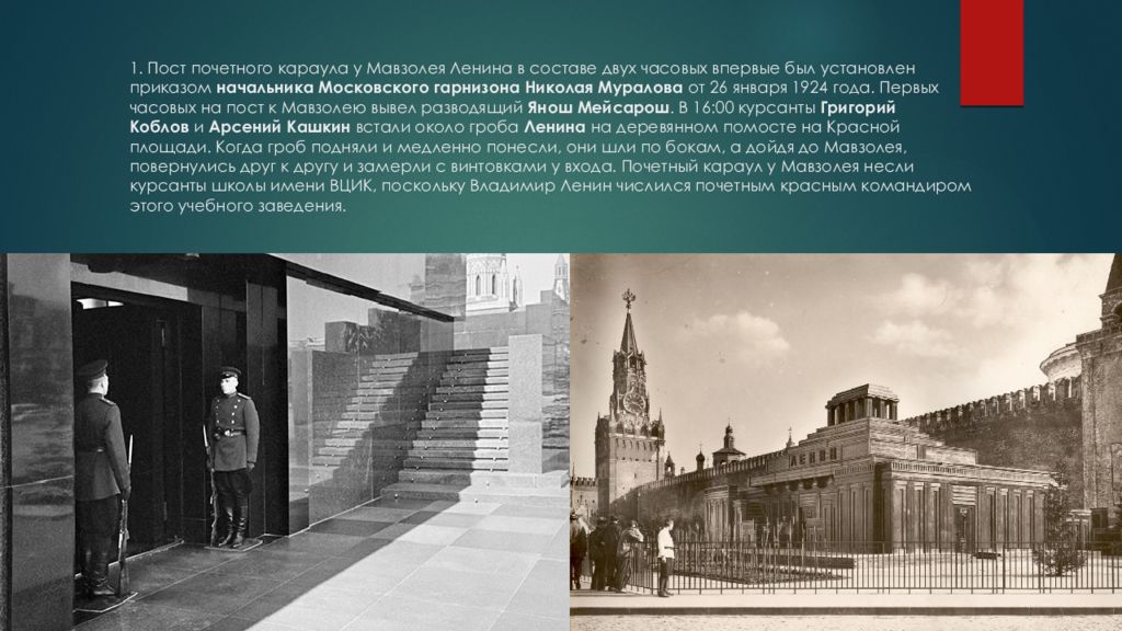 Слайд 14: 1. Пост почетного караула у Мавзолея Ленина в составе двух часовых впервые был установлен приказом начальника Московского гарнизона Николая Муралова от 26 января 1924 года. Первых часовых на пост к Мавзолею вывел разводящий Янош Мейсарош. В 16:00 курсанты Григорий Коблов и Арсений Кашкин встали около гроба Ленина на деревянном помосте на Красной площади. Когда гроб подняли и медленно понесли, они шли по бокам, а дойдя до Мавзолея, повернулись друг к другу и замерли с винтовками у входа. Почетный караул у Мавзолея несли курсанты школы имени ВЦИК, поскольку Владимир Ленин числился почетным красным командиром этого учебного заведения