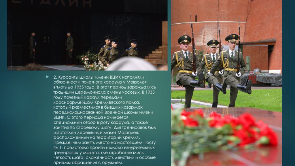 2. Курсанты школы имени ВЦИК исполняли обязанности почетного караула у Мавзолея вплоть до 1935 года. В этот период зарождались традиции церемониала смены часовых. В 1935 году почётный караул передали красноармейцам Кремлёвского полка, который разместился в бывших казармах передислоцированной Военной школы имени ВЦИК. С этого периода начинается специальный отбор в роту караула, а также занятия по строевому шагу. Для тренировок был изготовлен деревянный макет Мавзолея, расположенный на территории Кремля. Прежде, чем занять место на настоящем Посту № 1, предстояло пройти немало изнурительных тренировок у макета, где отрабатывались четкость шага, слаженность действий и особые приемы обращения с оружием.