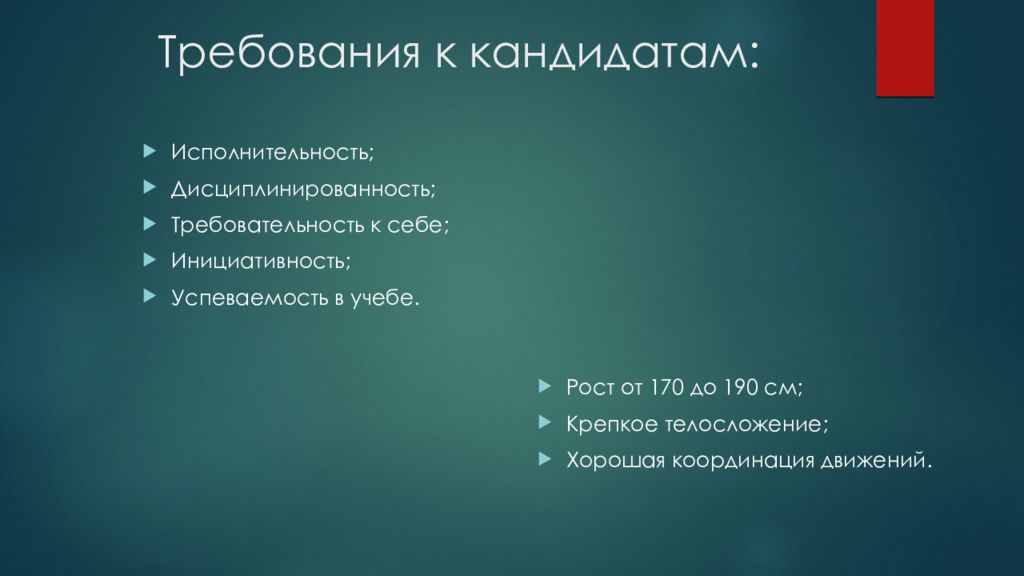 Исполнительность; Дисциплинированность; Требовательность к себе; Инициативность; Успеваемость в учебе. Рост от 170 до 190 см; Крепкое телосложение; Хорошая координация движений.