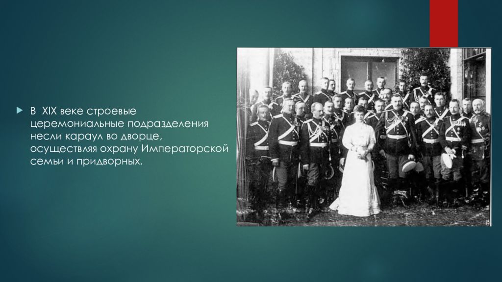 В XIX веке строевые церемониальные подразделения несли караул во дворце, осуществляя охрану Императорской семьи и придворных.