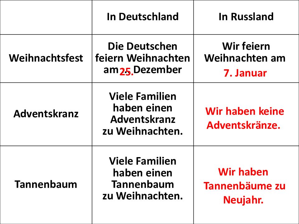 In Deutschland In Russland Weihnachtsfest Die Deutschen feiern Weihnachten am... Dezember Wir feiern Weihnachten am ... Adventskranz Viele Familien haben einen Adventskranz zu Weihnachten. ... Tannenbaum Viele Familien haben einen Tannenbaum zu Weihnachten. 25. 7. Januar Wir haben keine Adventskränze. Wir haben Tannenbäume zu Neujahr.