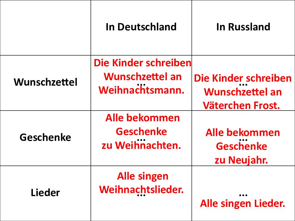 In Deutschland In Russland Wunschzettel ... ... Geschenke ... ... Lieder ... ... Die Kinder schreiben Wunschzettel an Weihnachtsmann. Die Kinder schreiben Wunschzettel an Väterchen Frost. Alle bekommen Geschenke zu Weihnachten. Alle bekommen Geschenke zu Neujahr. Alle singen Weihnachtslieder. Alle singen Lieder.