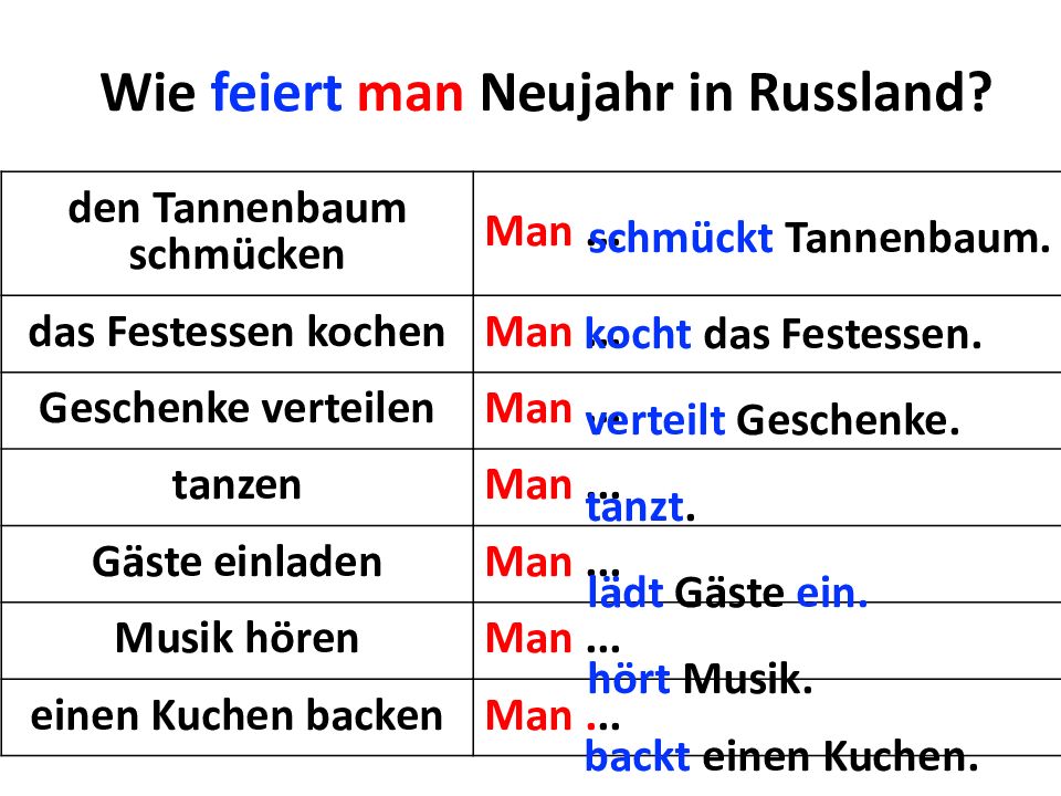 Wie feiert man Neujahr in Russland? den Tannenbaum schmücken Man... das Festessen kochen Man... Geschenke verteilen Man... tanzen Man... Gäste einladen Man... Musik hören Man... einen Kuchen backen Man... schmückt Tannenbaum. kocht das Festessen. verteilt Geschenke. tanzt. lädt Gäste ein. hört Musik. backt einen Kuchen.