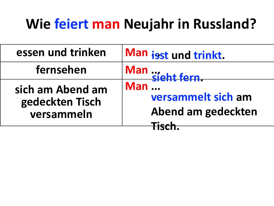 Wie feiert man Neujahr in Russland? essen und trinken Man... fernsehen Man... sich am Abend am gedeckten Tisch versammeln Man... isst und trinkt. sieht fern. versammelt sich am Abend am gedeckten Tisch.