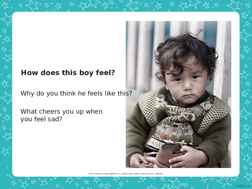 How does this boy feel? Photo courtesy of emifaulk (@flickr.com) - granted under creative commons licence – attribution Why do you think he feels like this? What cheers you up when you feel sad?