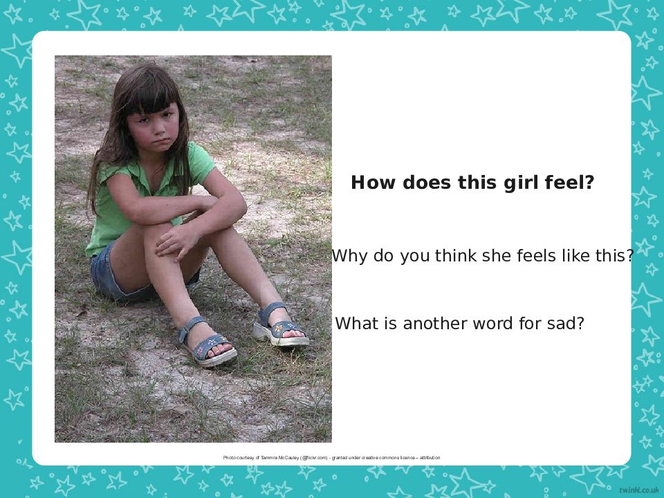 How does this girl feel? Photo courtesy of Tammra McCauley (@flickr.com) - granted under creative commons licence – attribution What is another word for sad? Why do you think she feels like this?