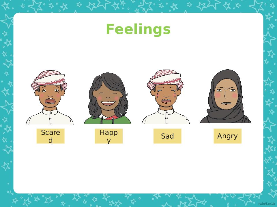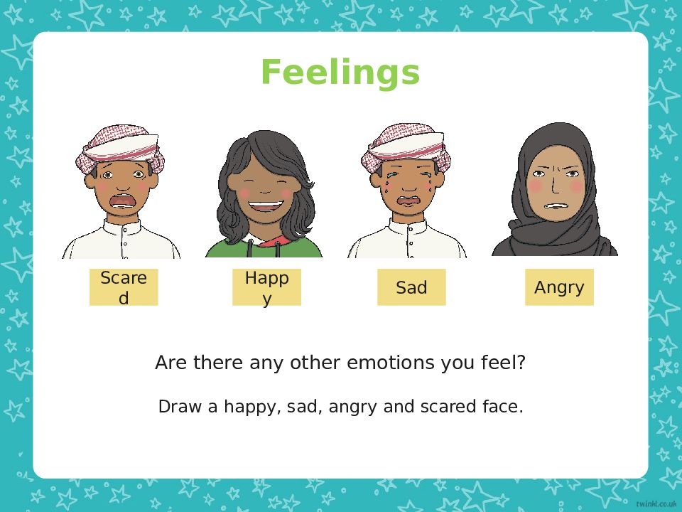 Feelings Angry Happy Sad Scared Are there any other emotions you feel? Draw a happy, sad, angry and scared face.