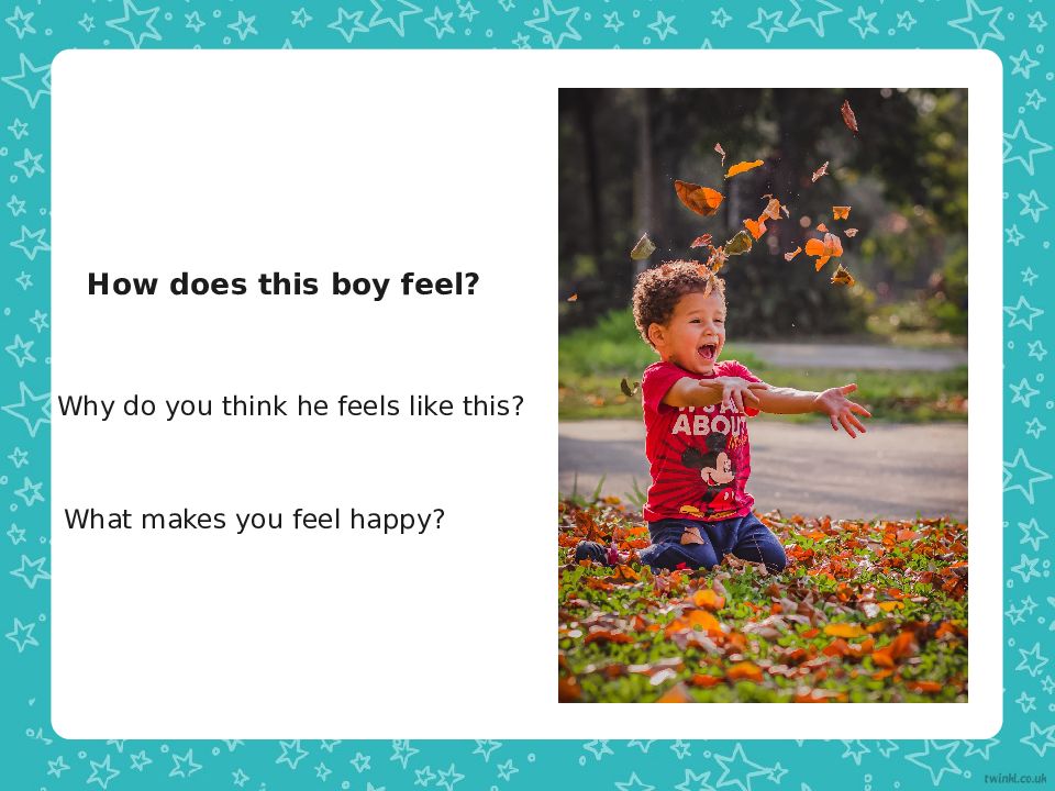 How does this boy feel? What makes you feel happy? Why do you think he feels like this?
