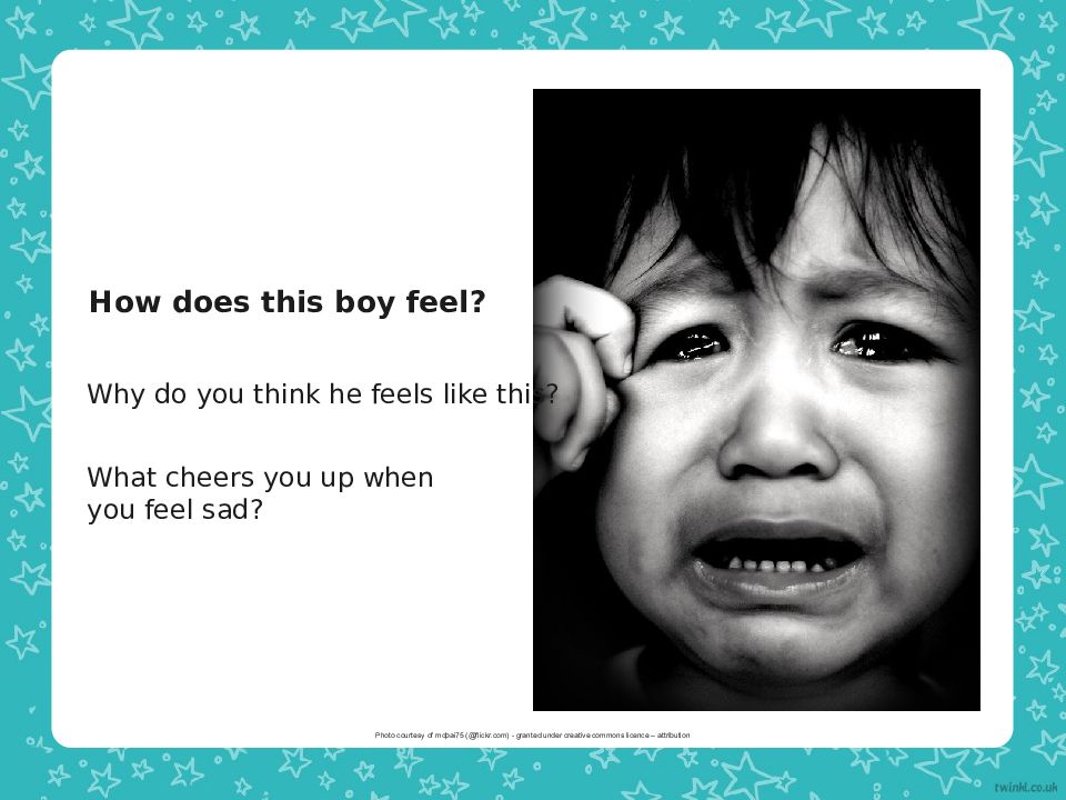 How does this boy feel? Photo courtesy of mdpai75 (@flickr.com) - granted under creative commons licence – attribution Why do you think he feels like this? What cheers you up when you feel sad?