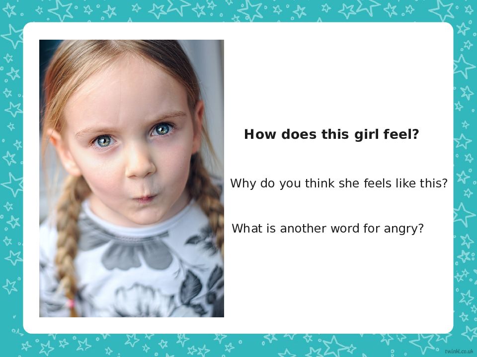 How does this girl feel? What is another word for angry? Why do you think she feels like this?