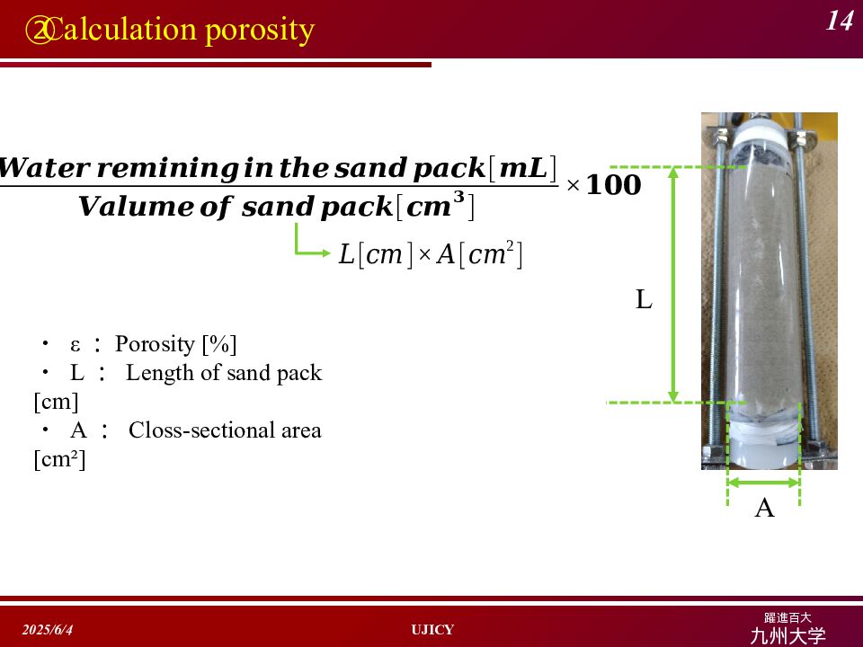 2025/6/4 UJICY L A ・ ε : Porosity [%] ・ L : Length of sand pack [cm] ・ A : Closs-sectional area [cm²] ② Calculation porosity