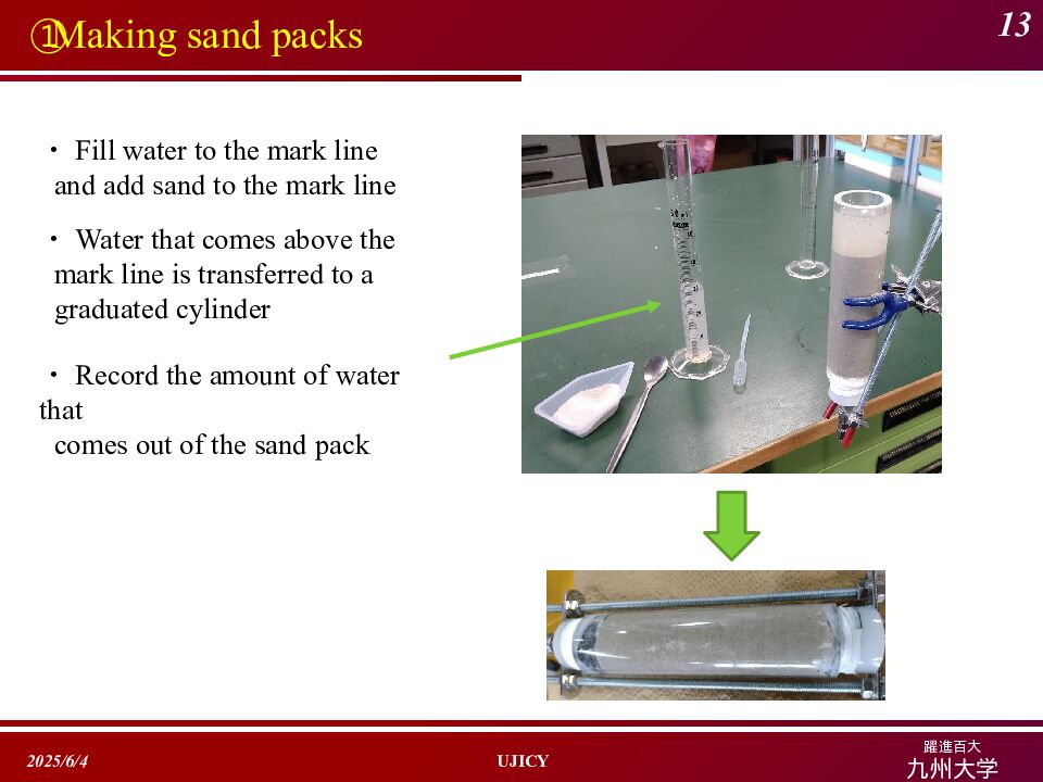 2025/6/4 UJICY ・ Record the amount of water that comes out of the sand pack ・ Fill water to the mark line and add sand to the mark line ・ Water that comes above the mark line is transferred to a graduated cylinder ① Making sand packs