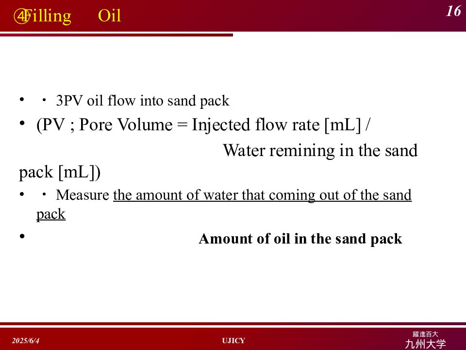 2025/6/4 UJICY ・ 3PV oil flow into sand pack (PV ; Pore Volume = Injected flow rate [mL] / Water remining in the sand pack [mL]) ・ Measure the amount of water that coming out of the sand pack Amount of oil in the sand pack ④ Filling Oil