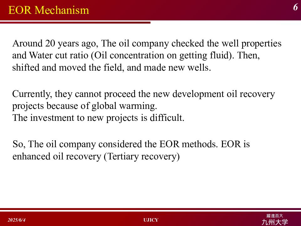 2025/6/4 UJICY EOR Mechanism Around 20 years ago, The oil company checked the well properties and Water cut ratio (Oil concentration on getting fluid). Then, shifted and moved the field, and made new wells. Currently, they cannot proceed the new development oil recovery projects because of global warming. The investment to new projects is difficult. So, The oil company considered the EOR methods. EOR is enhanced oil recovery (Tertiary recovery)