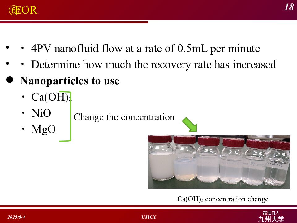2025/6/4 UJICY ⑥ EOR ・ 4PV nanofluid flow at a rate of 0.5mL per minute ・ Determine how much the recovery rate has increased Nanoparticles to use ・ Ca(OH) ₂ ・ NiO ・ MgO Change the concentration Ca(OH) ₂ concentration change