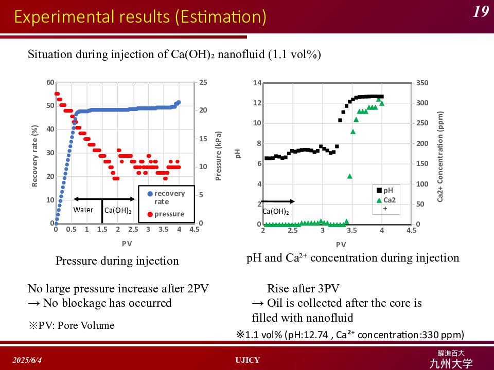 2025/6/4 UJICY Situation during injection of Ca(OH) ₂ nanofluid (1.1 vol%) Pressure during injection pH and Ca² ⁺ concentration during injection No large pressure increase after 2PV → No blockage has occurred ※PV: Pore Volume Rise after 3PV → Oil is collected after the core is filled with nanofluid Water Ca(OH) ₂ ※1.1 vol% (pH:12.74, Ca² ⁺ concentration:330 ppm) Ca(OH) ₂ Experimental results (Estimation)